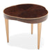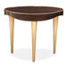 AICO Furniture Camellia Field End Table in Warm Pecan 9090205-400. The Camellia Field Shaped End Table brings a distinctive silhouette to your living space with its soft, curving form and warm pecan finish. The mahogany veneer top is framed with antique gold accents, highlighting its organic elegance. Perfectly designed to add visual interest, this end table pairs beauty with versatility.