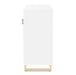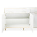 AICO Furniture Palm Gate Sideboard in Cloud White N9086007-108. The Palm Gate sideboard exemplifies a seamless blend of functionality and refined elegance. Showcased in a Cloud White acrylic finish complemented by exquisite Japan gold accents, this sideboard brings a modern yet timeless charm to any room. It features adjustable shelving within the cabinets for tailored storage solutions and drawers lined with plush velvet to gently cradle your essentials. With its sleek lines and sophisticated design, this sideboard is not just a piece of furniture—it's a centerpiece that elevates your dining experience.