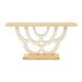 AICO Furniture Camellia Field Console Table in Caramel 9090223-134. The Camellia Field Console Table exudes bold artistry and refined craftsmanship. Its mahogany veneer top, finished in warm pecan, is complemented by a sculptural base in antique gold, reminiscent of cascading petals. Perfect for an entryway or living space, this table blends practical function with eye-catching design.