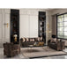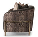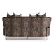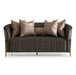 AICO Furniture Lisbon Loveseat in Onyx Gold LFR-LSBN825-ONX-806. A true masterpiece designed to elevate your living space. Adorned with exquisite curves, this eye-catching piece features a gleaming gold metal show frame that accentuates its luxurious appeal. The front body is elegantly draped in rich shades of Onyx chenille, while the back boasts a stunning Tiger Eye chenille jacquard, creating a harmonious blend of texture and color. Matching pillows in a black pearl chenille jacquard fabric with obsidian accents complete the look.