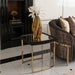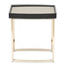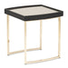 AICO Furniture Lisbon Side Table in Silken Matte Black LFR-LSBN202-826. Complement your seating area with our elegant side table, featuring a silky matte black top adorned with stylish channel edging. The thin gold legs add a touch of refinement, while the mirrored inlay creates a captivating contrast. This sophisticated side table effortlessly enhances your living space with its luxurious charm and functionality.