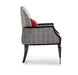 AICO La Francaise Accent Chair in Domino/Black LFR-FRSE834-DMO-805. Cloaked in a mesmerizing houndstooth jacquard velvet, this chair exudes a sense of refined opulence. The sleek black ice frame complements the rich texture, enhancing its contemporary elegance. A dazzling ruby-red pillow adds an irresistible pop of color, elevating the chair's visual appeal. This luxurious piece promises to leave your guests in awe, making it the perfect addition to any space seeking an infusion of glamour and sophistication.