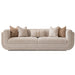 AICO Furniture Savannah Breeze Mansion Sofa Cashmere in Bright Gold LFR-SBRZ816-CSM-806. Enveloped in rich jacquard chenille, the Savannah Breeze Mansion Sofa introduces an experience of indulgent comfort and sophistication. Designed with grand proportions, this statement piece provides the perfect setting for entertaining loved ones or savoring moments of serene relaxation. Five elegant accent pillows, including striking animal patterns and a jewelry-adorned centerpiece, bring a touch of fashion-forward sophistication to your home. Enriched with signature gold accents, this sofa effortlessly embodies grandeur and timeless elegance.